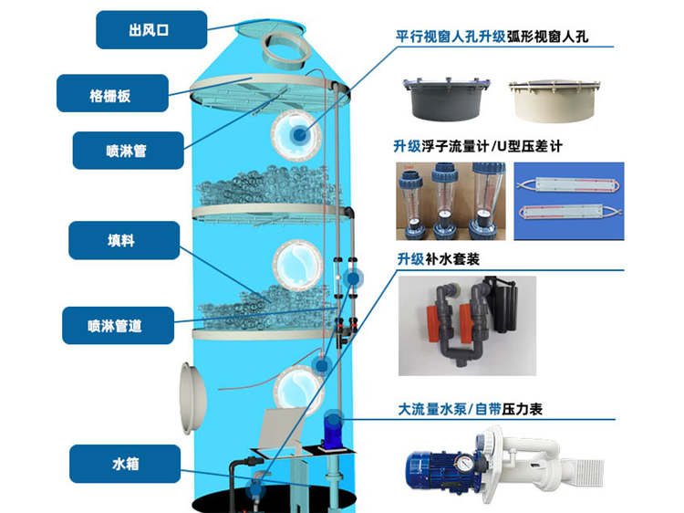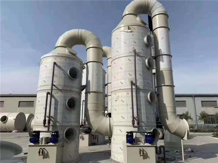 PP噴淋塔也叫做PP洗滌塔、酸霧凈化塔–酸堿廢氣處理設(shè)備;噴淋塔工作原理:噴淋塔主要的運(yùn)作方式是廢氣由風(fēng)管引入凈化塔,經(jīng)過填料層,廢氣與吸收液進(jìn)行氣液兩相充分接觸吸收中和反應(yīng),酸霧廢氣經(jīng)過凈化后,再經(jīng)除霧板脫水除霧后由風(fēng)機(jī)排入大氣。吸收液在塔底經(jīng)水泵增壓后在塔頂噴淋而下,之后回流至塔底循環(huán)使用。凈化后的酸霧廢氣達(dá)到地方排放標(biāo)準(zhǔn)的排放要求,低于國(guó)家排放標(biāo)準(zhǔn)。噴淋塔的結(jié)構(gòu)組成:酸堿廢氣塔分單塔體和雙塔體以及立式噴淋塔與臥式噴淋塔。用法蘭分段連接而成。具體由貯液箱、塔體、進(jìn)風(fēng)段、噴淋層、填料層、旋流除霧層、出風(fēng)錐帽、觀檢孔等組成。
